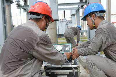 国网荆门供电公司大力开展“百个电力支部结对全市百家企业迎峰度夏平安行”活动。图为8月14日,该公司检修分公司变电修试党支部党员上门为福耀玻璃(湖北)有限公司110千伏变电站义务检测电力设备。(黄林摄 吴征宇文)