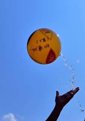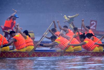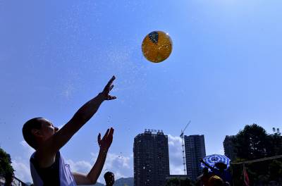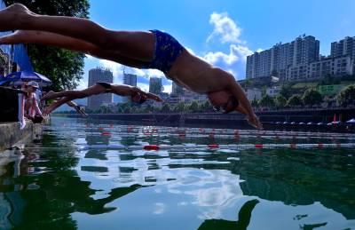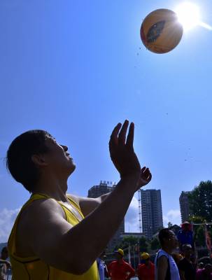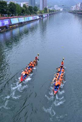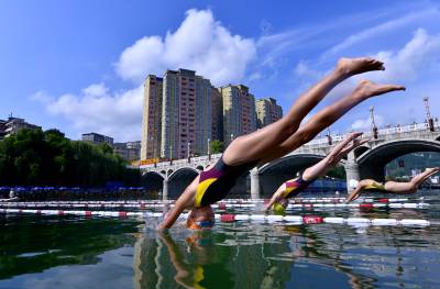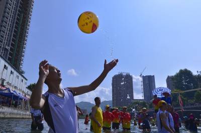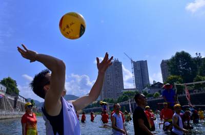 8月16日,选手在宣恩县城贡水河上参加比赛。 当日,历时一周的武陵山区水上运动会完成所有赛程。在三伏天里进行的“水上排球”、“水上拔河”、秋季赛龙舟等特色比赛项目,成为来自湖北、湖南、重庆等省市的1000多名运动员在酷暑天里清凉戏水的“水上福利”。 武陵山区是以武陵山脉为中心、地处湘鄂渝黔四省(市)毗邻区的少数民族聚居区,境内沟壑纵横,山清水秀,景色宜人。(视界网 宋文摄)