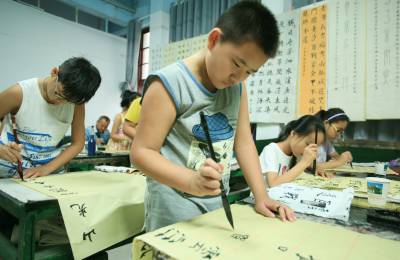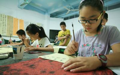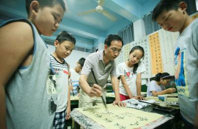 8月17日,中国书法之乡---湖北省黄冈市武穴实验小学的一群孩子们,在中国教育学会书法教育专业委员会、省书法家协会会员,书法教学金奖辅导老师、全国写字教育先进工作者王必超等一批老师的辅导下,在书法艺术的海洋里畅游快乐的暑期。该市教育部门严令禁止有偿补课后,孩子们可以自由选修自己喜爱的艺术门类渡假。视界网冯怡红摄