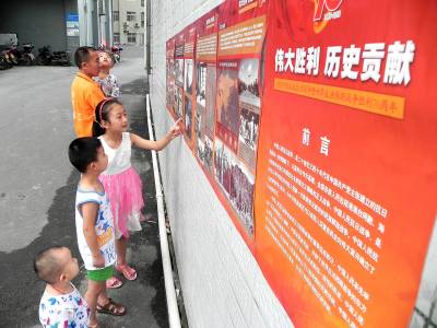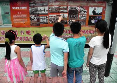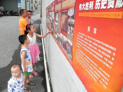 全民铭记历史憧憬未来 8月19日, 十堰市郧阳区的街道、社区、公共场所等地张贴有“伟大胜利、历史贡献”纪念中国人民抗日战争暨世界反法西斯战争胜利70周年宣传海报,独特的色彩和画面吸引了诸多学生和市民观看,铭记历史,不忘国耻。 (视界网 张传郧 十堰市郧阳区青曲镇初级中学 13635714262 442531)