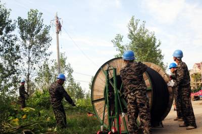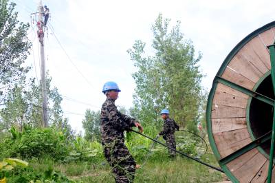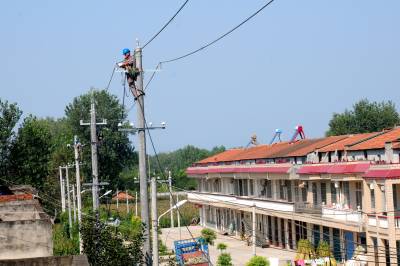 8月22日,在老河口市李楼镇王营村,电力工人正在架设低压电力线路,解决该村的低电压问题。入夏以来,老河口市供电公司已新增配变112台,新增容量15620千伏安,新建及改造低压线路172.92千米,总投资金额4800万元,重点解决农村地区的低电压和用电卡口问题。