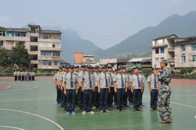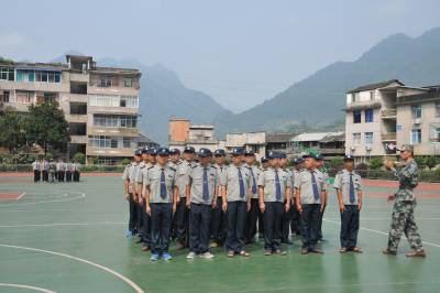 8月24日,鹤峰县实验中学操场,56名学校专职保安正在教官的带领下,进行队形队列操练、军容军姿等方面的军事化训练。当日,该县组织中小学和幼儿园专职校园保安,开展为期4天的岗位技能培训,提升业务水平和专业技能,确保学校师生安全。