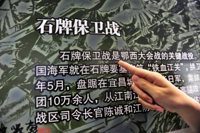 “石牌保卫战”发生地石牌村,这里因峡江南岸象鼻山中有一块类似令牌的巨石而得名,它高40米,顶宽1.2米,厚4米,重达4300余吨。长江因它在这里突然右拐110度,构成天然战争天堑,为历代兵家必争之地。