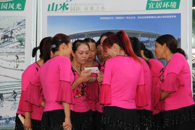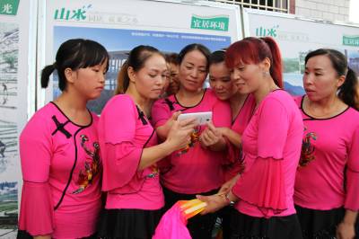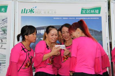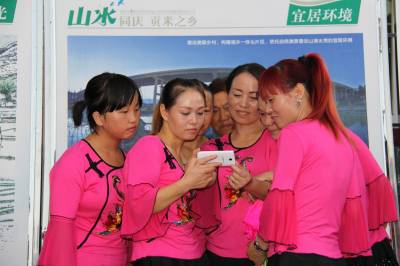 位于调水中线工程的竹溪县,在建设美丽富饶的文明县城同时,以家庭教育为突破口,以传统文化对接现代文明,传递精神文明正能量,实现了“鼓腰包”又“富脑”。图为竹溪县同庆沟村的女演员们在文艺汇演后观看演出视频的欢快一景。(2015年8月于竹溪县中峰镇同庆沟村)