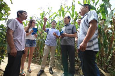 图为巴东气象局副局长郑都华(中)正在给重庆的几个农民介绍当地气候。