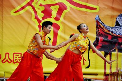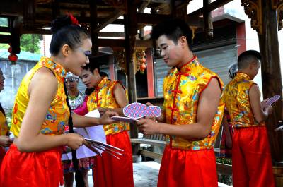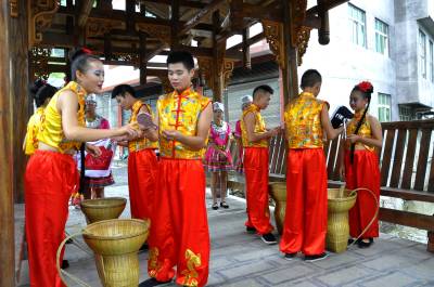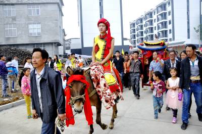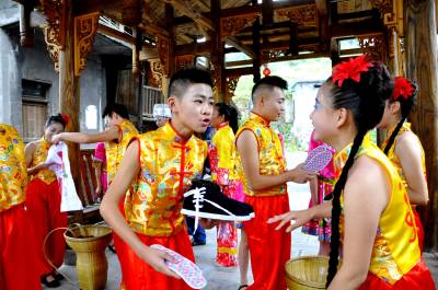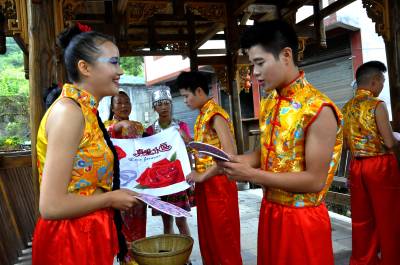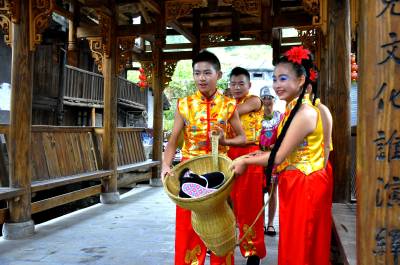 8月25日,湖北省恩施市红土乡石灰窑集镇,两位身着节日盛装的土家族男女孩正在民俗旅游文化节上准备体验赶场相亲的表演。