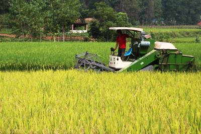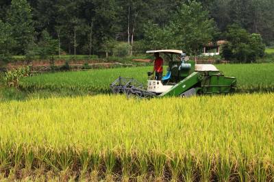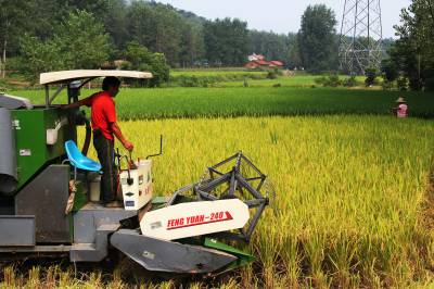早熟中稻“抢鲜”开镰 8月25日省谷城县茨河镇下磨石村机手正在帮助农民抢收早熟中稻。该县农民市场意识日益增加。种植的5000多亩早熟中稻,“抢鲜”半月上市后,居民尝鲜,农民挣巧钱。视界网马明刚摄