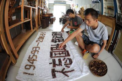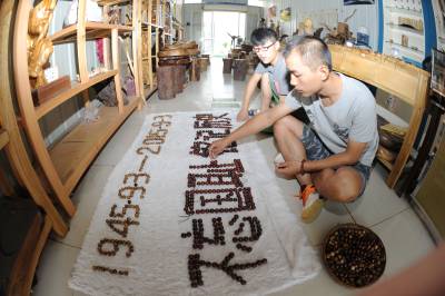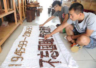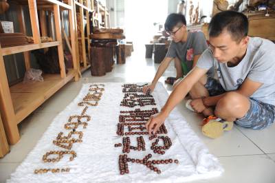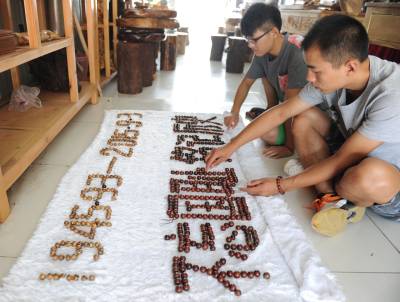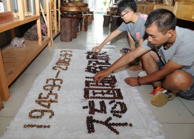 8月26日,在襄阳市樊城区七桥花鸟市场森林木屋内,刘田和他的朋友在用594颗小叶紫檀木串珠串成铭记历史、不忘国耻的匾牌,用自己的方式纪念自己的曾祖父和遇难同胞,同时庆祝抗战胜利70周年,并向同伴讲述历史,不忘国耻。
