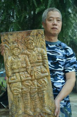 25日,安陆市府城北正社区陈代胜展示创作的木雕作品《太行山上》。1947出生的陈代胜,原为安陆棉纺厂工人。他一生热爱艺术创作,十分敬仰老一代革命家,多年来,他用一支铅笔创作出孙中山、毛泽东、胡锦涛、斯大林等中外革命领袖的素描作品。陈代胜退休金微薄,老伴来自农村,没有工作,常年拾荒贴补家用,虽年事已高,但创作热情丝毫不减。2008年,他创作的木雕《中国根》走进了北京奥运展馆,入选1999年《中国专家人才库(五)》。