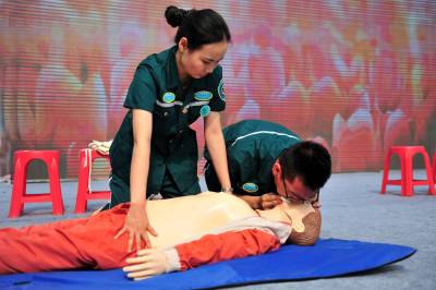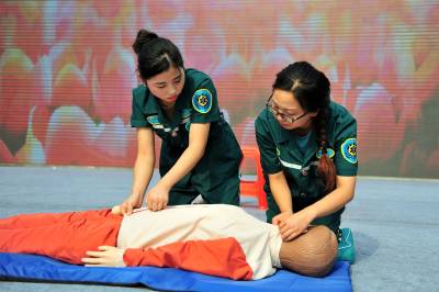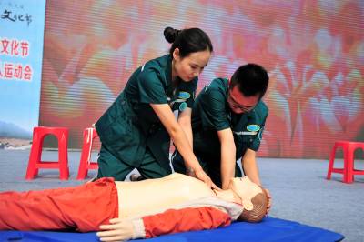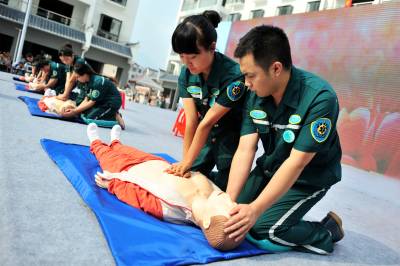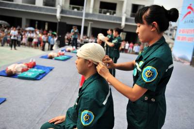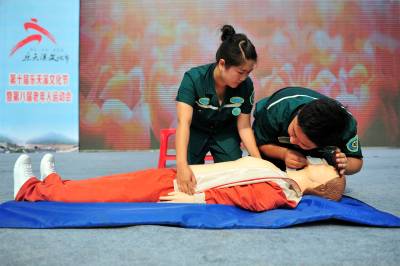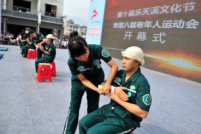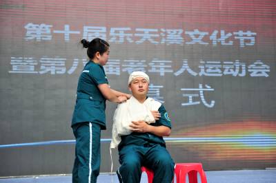 2015年8月25日,在宜昌市夷陵区乐天溪镇第十届文化节开幕式现场,开展了以“关爱生命 救在身边”为主题的群众性应急救护技能展示活动,当地医务人员通过演示心肺复苏术、头部包扎、前臂骨折固定和大悬臂带吊包扎的操作步骤,向群众传授在面对自然灾害、各种突发疾病和意外事件时,对伤病员实施及时、有效的初步救护技能,以此大力倡导“人人学急救、急救为人人”理念,为自己和他人筑起一道生命健康保障线。视界网 张国荣 摄