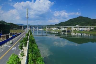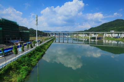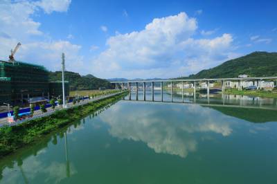 和谐山乡美景如画 8月27日,白云悠悠,河水清澈,谷竹高速公路竹山县潘口乡小漩村堵河大桥与该县城关至潘口一级公路的水面倒影、路边的绿树构成一幅和谐的画面。近年来,竹山县以创建省级森林城市和“两修”活动为契机,加大公路临河的生态修复工程,加快公路沿线绿化工程,生态环境得到明显改善,山乡面貌发生新变化。(视界网 章磊 摄)