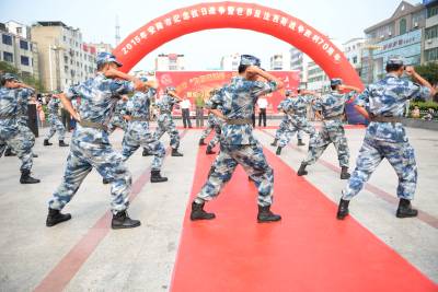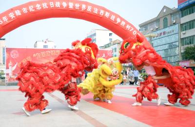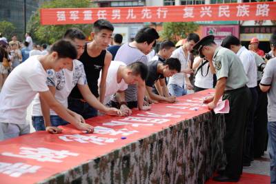 8月28日,安陆市举行纪念抗日战争胜利70周年暨“为国防添彩,树青春风采”誓师签名活动,驻军部队官兵、应征入伍青年、高中军训新生等共计400多人参加本次活动。 图①为,空军95263部队官兵正在表演军营麒狮舞。 图②为,空军95263部队官兵正在表演军体拳。 图③为,100余名应征入伍青年代表在“为国防添彩,树青春风采”誓师横幅上签名。 视界网 黄德望 摄
