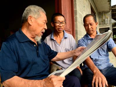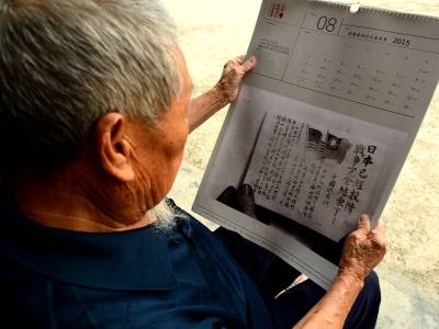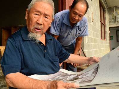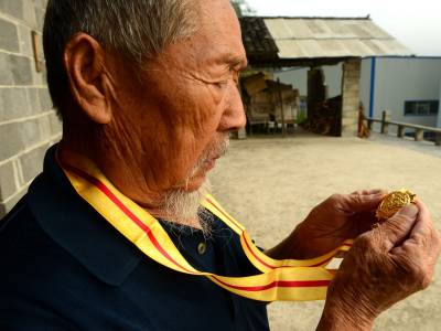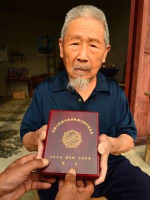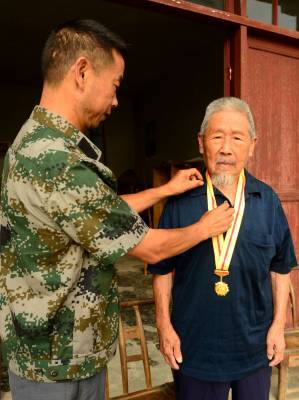 8月30日,来凤县革勒车镇民政办,将中共中央、国务院、中央军委颁发的“中国人民抗日战争胜利70周年纪念章”送到抗战老兵田荣家中,发现他正在对着宣传画册给两个儿子讲抗日故事。