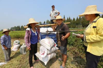 【活跃在田间的粮食经纪人】 31日,新洲区旧街梅河村,粮食经纪人王银发在为收购的稻谷过秤。目前正是“双抢”农忙季节,新洲1200余名粮食收购经纪人活跃在田间地头,既减轻了农民卖粮负担,又为自己增加了收入。 视界网 邱新明 摄 单位及地址:武汉市新洲区委宣传部 邮编:430400 电话:13207146140