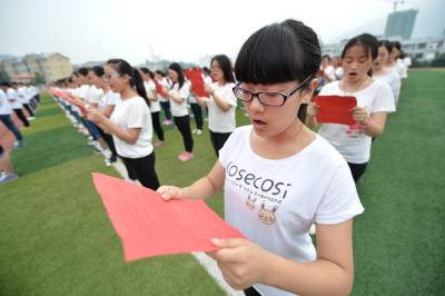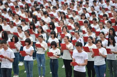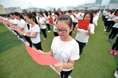 当日,保康县纪念抗日战争胜利70周年暨“缅怀抗战先烈·诵读抗战家书”活动在保康县一中举行,该校800余名学生在操场上齐诵抗日英雄张自忠将军的家书,缅怀英烈,表达爱国之情。 1940年5月,湖北枣宜会战打响后,前线部队伤亡很重,战况对中国很不利。张自忠将军十分焦灼,5月6日晚,他提出“过河督战”,并写下了“抗战家书”。5月7日拂晓,张自忠过河督战。5月16日,在湖北省宜城市板桥店镇南瓜店十里长山,张自忠被日军包围壮烈殉国,年仅49岁。(视界网 杨韬 摄)