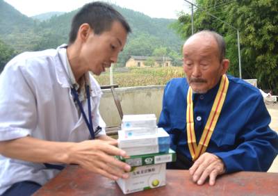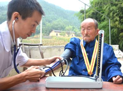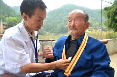 9月2日,巴东县官渡口镇卫生院医生正在为抗战老兵赵维珍量血压等健康体检。 赵维珍家住官渡口镇小高山村1组,今年96岁,1941年在75军辎重部队服役5年之久,当时负责为抗日前线运送粮食、弹药、医药等物资,左腿中弹受伤。该镇为纪念抗战胜利70周年,组织政府干部、医生上门看望慰问抗战老兵,并进行健康检查,免费送药品等慰问物资。 ( 巴东县官渡口镇政府 向传辉摄 电话189*63928551)