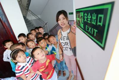 9月1日当地开学第一天,竹山县宝丰镇施洋小学附属幼儿园的教师正在指导幼儿认识安全出口标志。今秋开学,该县各学校通过组织学生观看安全教育图片、讲安全故事、学唱安全教育歌等多种形式,使学生掌握初步的安全常识,提高学生的安全防范意识和综合能力,教育学生“开开心心上学,平平安安回家”。