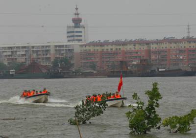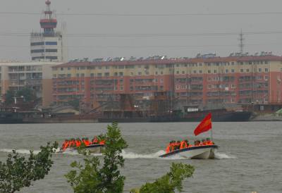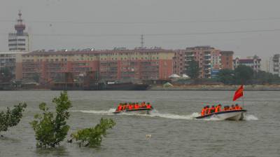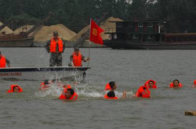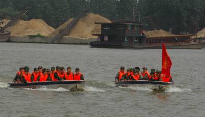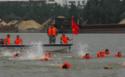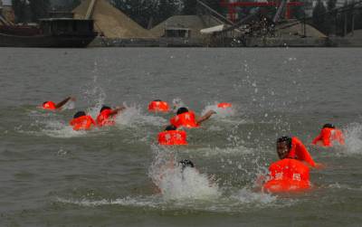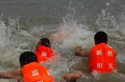 6月2日,湖北省襄樊市襄阳区民兵应急分队在唐白河上进行防汛救生演练,练兵迎战汛期到来。 据气象部门预测,今年,湖北襄樊有可能发生大汛,为强化处理突发汛情,襄樊市各级部门强化训练,制定应急预案,确保汛期群众安全。