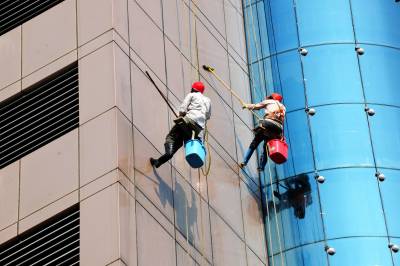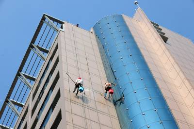 9月6日,在巴东县西壤坡小区,两名“蜘蛛人”正在清洁高楼外墙。今年,巴东县启动国家园林城市、国家卫生县城、省级森林城市及省州文明城市“四城同创”工作,以亮化、美化、绿化、洁净为抓手,着力打造长江边上最干净的县城。(视界网 王祖满 15272999779)