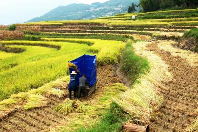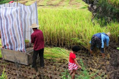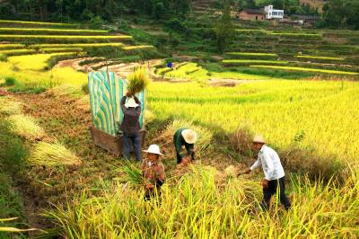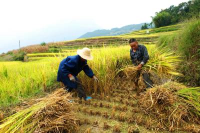 9月3-4日,在巴东县溪丘湾乡白湾村看到,金黄色的稻穗压弯枝头,村民互帮互助抢抓晴好天气抢收成熟的稻谷,一起分享水稻丰收的喜悦。目前,全县2.8余万亩水稻开镰收割。(视界网 王祖满摄 15272999779)