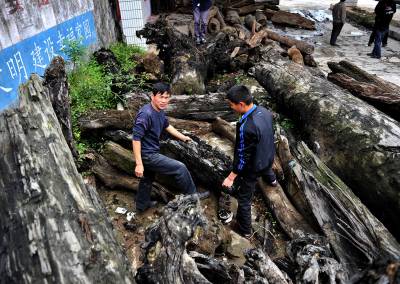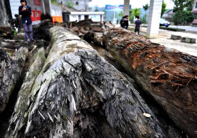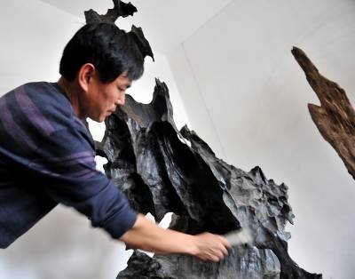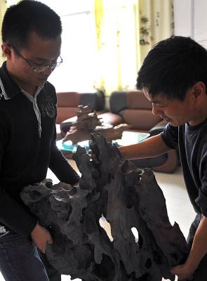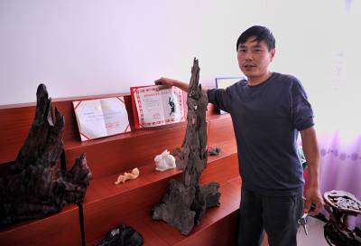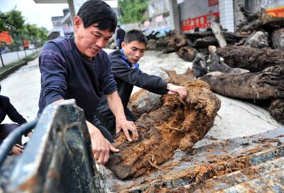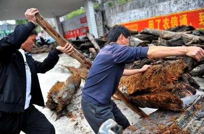 2日,宣恩县椒园镇农民黄志鹏又运回一车千年古木。他说:这些在地下”沉睡”了几百年甚至上千年的树木,经过去腐、设计、雕刻、上漆等加工后,又能”开新花”——创造出几倍甚至数十倍于购买朽木成本的价值。据黄志鹏介绍,这些树在被埋后难以接触空气而逐步被炭化,质地变得十分坚硬,而且也相当沉重。目前他进行雕刻加工的原材料,大多来自湖南、湖北、重庆等地,多为河道施工挖出来的。(视界网签约摄影师:宋文摄)