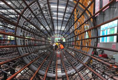 9月6日,黔张常铁路项目湖北咸丰段1#钢构件加工厂内,两名工人正在焊接钢筋笼。