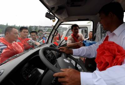 昨日,荆州市的13家种粮大户的代表在当地天问广场,每户接受了一辆由东风股份汽车有限公司生产的轻型卡车。这次对种粮大户的奖励,由省财政安排的2300万元专项资金,对全省2008年以来种植粮食150亩以上的农户给予奖励,此奖励政策将惠及全省近千户农民家庭。(记者杨平摄)