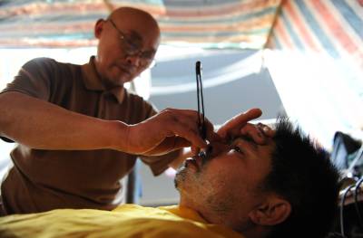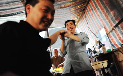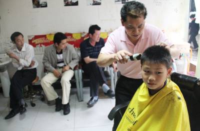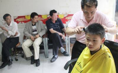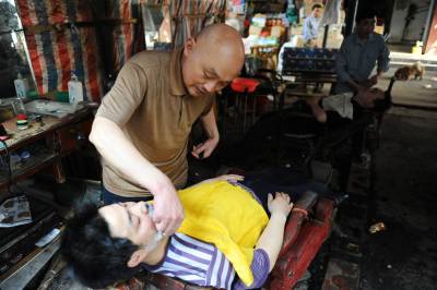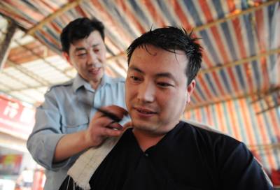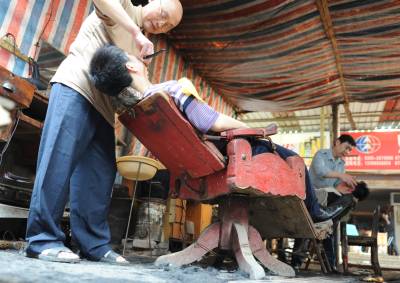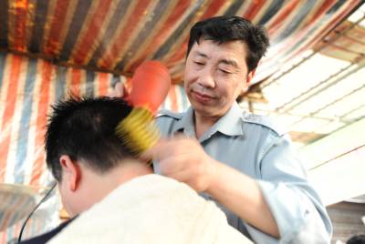 传统与时尚,不该剃头挑子一头热昨日,理发师刘师傅给顾客理发后做免费按摩。潜江市中心菜场旁有5家传统理发店,镗刀片、大镜子、推子,折叠剃刀,升降座椅理等一些理发的”老古董”给人怀旧的感觉。这里的理发师一般是做了几十年理发生意的老师傅,年轻时,他们肩扛剃头挑子,走街串巷,受到群众的欢迎。如今在发廊林立的都市里,潜江市的传统理发仍然成为老百姓不可或缺的一部分。老师傅们技艺精湛,顾客在这里理发后还可享受掏耳、按摩、整背等服务,消费群体主要是工薪阶层及低收入者,其中中老年人、儿童、婴儿居多。平价服务,技术精湛是众多消费者选择传统理发店的原因。和火热的现代发廊相比,传统理发显得有些冷清。老师傅们担忧,传统理发手艺后继乏人,面临失传,他们期待传统理发重放异彩。本报视界网吴燕军摄