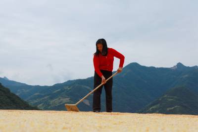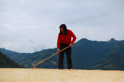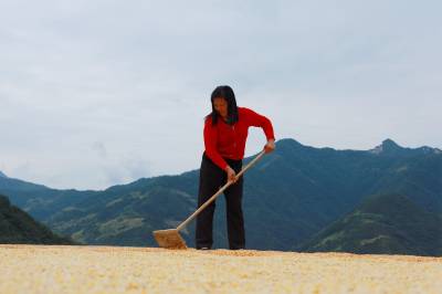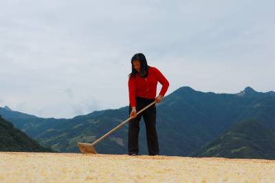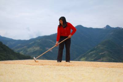 晒丰收 9月14日,竹山县官渡镇蒲济村村民在晒台上晾晒玉米。秋收时节,竹山县农民把丰收的玉米摊铺在晒台上晾晒,形成山村特有的丰收景象。(视界网 章磊 摄)