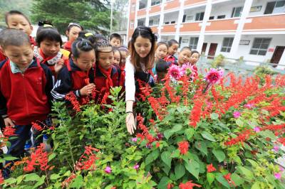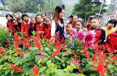 9月14日,竹山县宝丰镇新茶小学校园内绿树成荫、花香四溢,教师肖艳正在给学生讲解花卉知识和爱花护花常识。据悉,为进一步优化育人环境,加快生态校园建设,推进义务教育均衡发展,该镇各学校积极开展“校园绿化、校园文化、校园净化、校园规范化”“四化”创建活动,使绿色生态校园建设制度化、规范化、常态化,提高了师生的学习生活质量,也潜移默化地促进了师生自觉爱护花草树木、保护环境意识的形成。