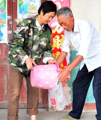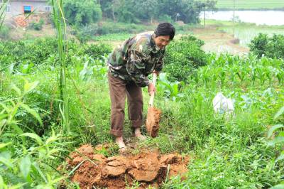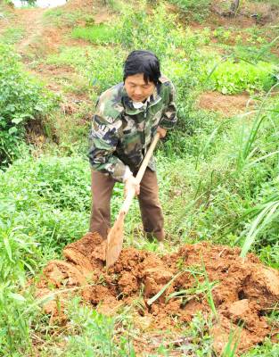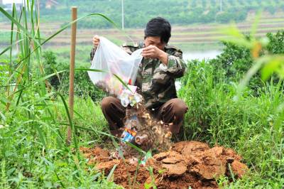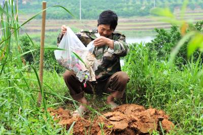 2010年5月,湖北省宜昌市夷陵区在鸦鹊岭镇梅店村开展新型农民教育试点活动,该村3组马三喜等村民的房屋周围没有垃圾房,他们将生活垃圾装袋后,运到自己承包地里深埋,用实际行动保护村庄环境,倡导村民增强环保意识,争做新型农民。本报视界网张国荣摄