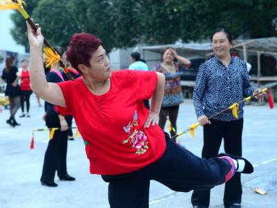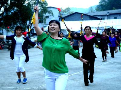 9月16日,湖北省来凤县革勒车镇二龙社区的大嫂们在老师的带领下跳起欢快的莲湘舞。连日来,该镇工会组织社区莲湘舞蹈队的近50名队员,利用晚上在集镇广场苦练莲湘舞技艺,准备在中华人民共和国成立66周年文艺晚会上一展风采。