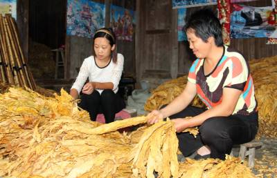 9月17日,咸丰县高乐山镇白果坝村13组烟农冉戍芳与女儿在挑选烟叶。该县农民积极抢收(售)农产品,增加农业经济收入。 本报视界网 周方奎 摄