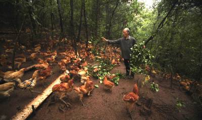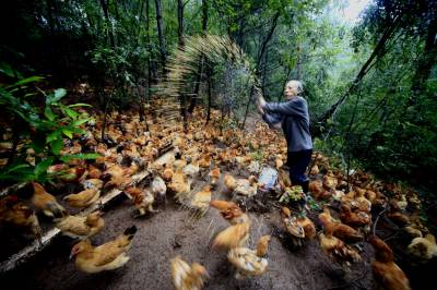 9月17日,竹山县擂鼓镇佑城社区二组村民沈发扬给林下鸡群投放饲料。据了解,今年64岁的沈发扬夫妇二人从四月上旬开始利用房前屋后的25亩森林资源,用钢丝网把成片的林子“围”起来发展养鸡产业。同时他在县畜牧局大力支持下,无偿给他提供3000只“郧阳大鸡”仔鸡苗,林下放养鸡群以野外虫子和杂草为食,肉嫩味鲜,经过四个多月精心管理 如今他林下饲养的无公害土鸡大约3—4斤左右,每只鸡能卖到80—100元,纯收人超过10万元。目前,该县从事林下种植、养殖大户达800多户,仅此一项户平每年增收16000元以上,林下产业将是以林养林、林农增收的“钱”景产业。