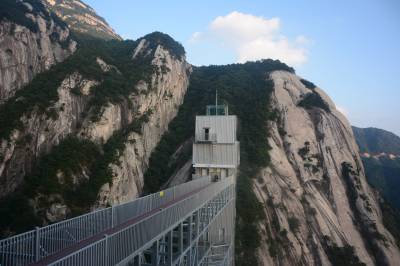 垂直观光电梯依山体垂直建设,位于天堂寨景区海拔1080米的小华山一线天悬空崖壁处。项目总投资2000多万元,总高程145米,行程高度135米,运行时速最高2.5米/秒。电梯分左右两部,每部每次可承载18人,单次运行时间54秒,日载客量可达3000人次。