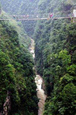 在石门河景区的步云桥,一对身着茅古斯服装的男女青年,从160米高的吊桥徐徐下降,为了爱,即便是万丈沟壑也何所畏惧!
