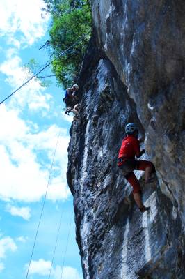 1、着茅古斯服装的游客攀岩“狩猎采药”。(参与游客按难易程度设定奖品)