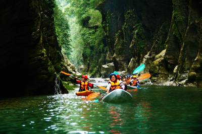 2、男女游客两人一组,着茅古斯服装,划皮划艇。一人划桨,一人用网兜捉鸭,在规定的时间内(10分钟),抓到就免费带走。