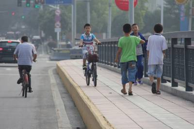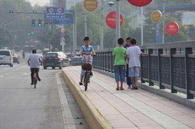 9月19日上午,一名小学生在丹江口市水都大桥人行道上骑自行车,期间还不时低着头,身旁道上还有3名同学边走边玩,一名学生还背朝后退着走路,看着让人捏把汗。小学生安全问题一直是社会关注的热点之一,老师、家长及交通部门平时应加强孩子的交通安全教育,让学生了解交通安全的常识,教育学生要遵守交通规则,注意交通安全,珍惜生命。 本报视界网 钱芹 摄