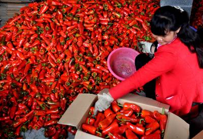 图一为9月22日,湖北省恩施市沙地乡神堂村村民正将收获的辣椒精选装箱。