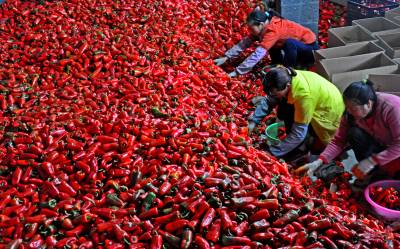 图二9月22日,湖北省恩施市沙地乡神堂村村民正精选辣椒。