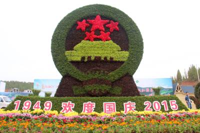 2015年9月25日,在湖北省十堰市郧阳区安阳镇汉江绿谷拍摄的“国徽”图案。 当日,湖北省十堰市郧阳区安阳镇举办“菊韵汉江•情满郧阳”首届南水北调核心水源区(中国•十堰)菊花文化节——汉江绿谷开园仪式。为举办本次菊花文化节,同时也为了迎接中秋、国庆节的到来,汉江绿谷共建三个主题花园,分别为菊花博览园、南水北调主题花园和菊艺展示园,园内处处花团锦簇,装扮一新,吸引了各地的游客前来游览。 (视界网 曹忠宏 摄)