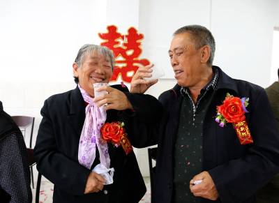 福利院工作人员带领她们去民政部门办理了结婚证,并为她们举办了一个热闹的婚礼。当天,福利院张灯结彩、喜气洋洋,三对“新人”胸前戴着礼花,乡民政办负责人在婚礼上为她们证婚,见证她们的爱情。王国柱和谭东芝老人喝了交杯茶后激动得流泪:“感谢共产党,感谢福利院,给了我们一个新家……”