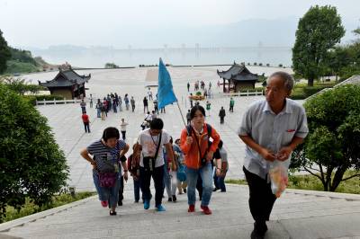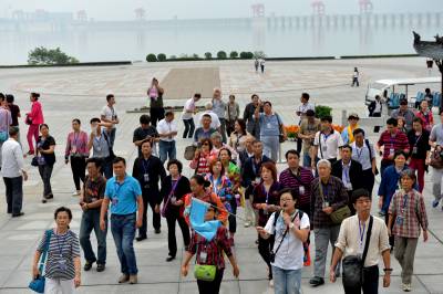 9月27日中秋节,游客在距三峡大坝仅600米的屈原祠景区内游玩。