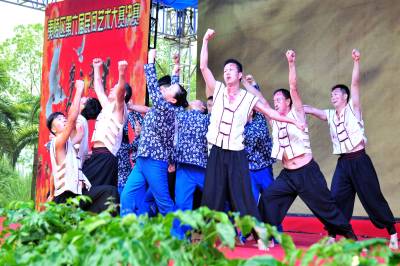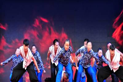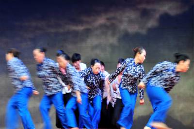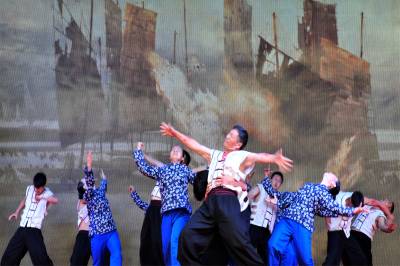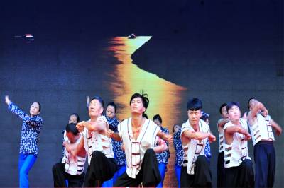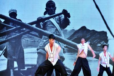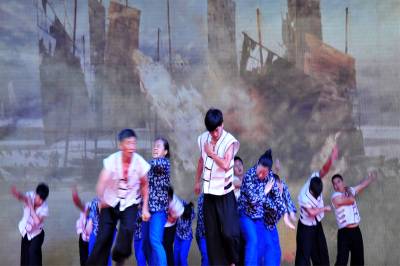 2015年9月26日,由宜昌市夷陵区三斗坪镇群众演员排演的宜昌大撤退情景剧“峡江船工”,在夷陵迎国庆民间艺术大赛上搬上舞台首次亮相展演。视界网 张国荣 摄