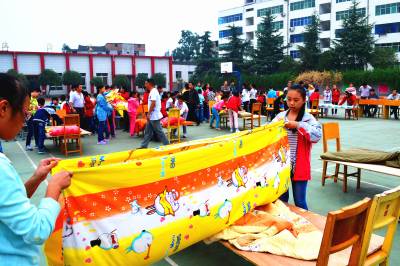 乡村学生比内务赛技能 “加油、加油!”9月29日下午,湖北省十堰市郧阳区柳陂镇初级中学在操场上进行一场盛大的内务技能大赛。40名住校留守学生合作拆、装、叠被子、床上整理,“忙”得不亦乐乎。该活动培养了学生的自理能力和自主管理意识,增进了同学们的集体荣誉感和责任感,丰富了课余生活。 (供稿:湖北省十堰市郧阳区柳陂镇中心小学 杨显有 13277199605 442532)