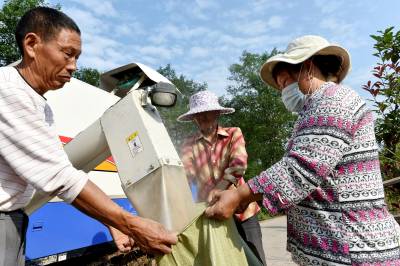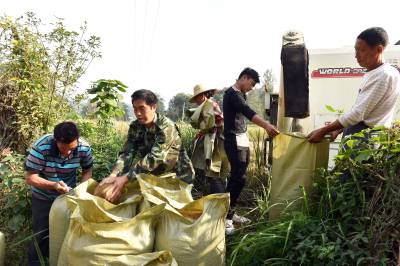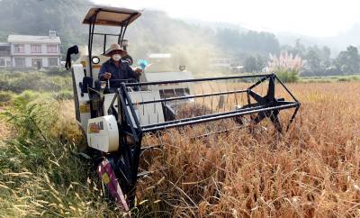 2015年9月29日,中国有机谷核心区——湖北省南漳县巡检镇汉三村正在收割有机水稻。汉三村是湖北文东集团最早种植有机水稻的山村之一。他们按照30年不变的政策将土地从农民手中流转过来,并请农民种植有机农作物。今年,已通过国家认证的3340多亩面积的有机水稻喜获丰收,产量可达116.9万公斤。