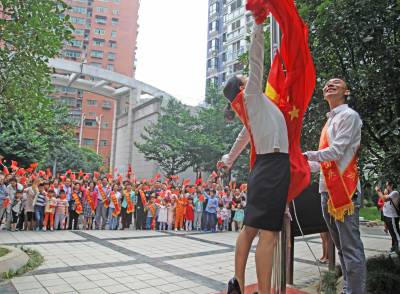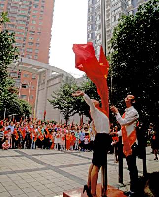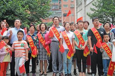 10月1日清晨,宜昌市西陵区学院街办廖家台社区美岸长堤小区内红旗招展,人头攒动,小区内的近百名业主代表,齐聚在楼宇下的空地,自发地举行着隆重而别致的升国旗仪式。