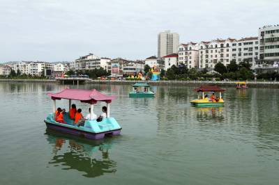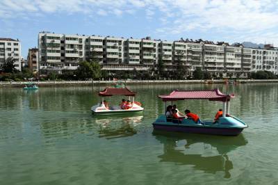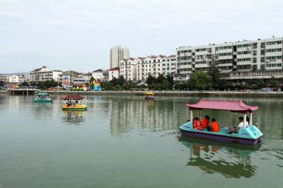 10月2日,游客在房县城区西河乐园荡舟嬉水。该县依托水资源蕴藏丰富的优势,招商引资发展民营水利产业,实行流域、梯级、滚动开发小水电站,利用水库、塘堰养鱼,引导当地农户养殖大鲵(俗称娃娃鱼)。目前,全县投运民营水电站93座,装机21万千瓦,水库养鱼77座,养殖大鲵70万尾,年均实现水利产业收入2.3亿元,提供财税收入居全县第一。