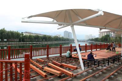 图一:10月7日,房县正在加紧建设城区西河半岛湾段水上公园观景平台
